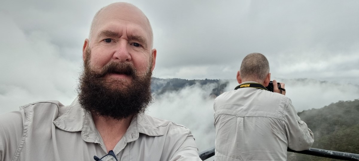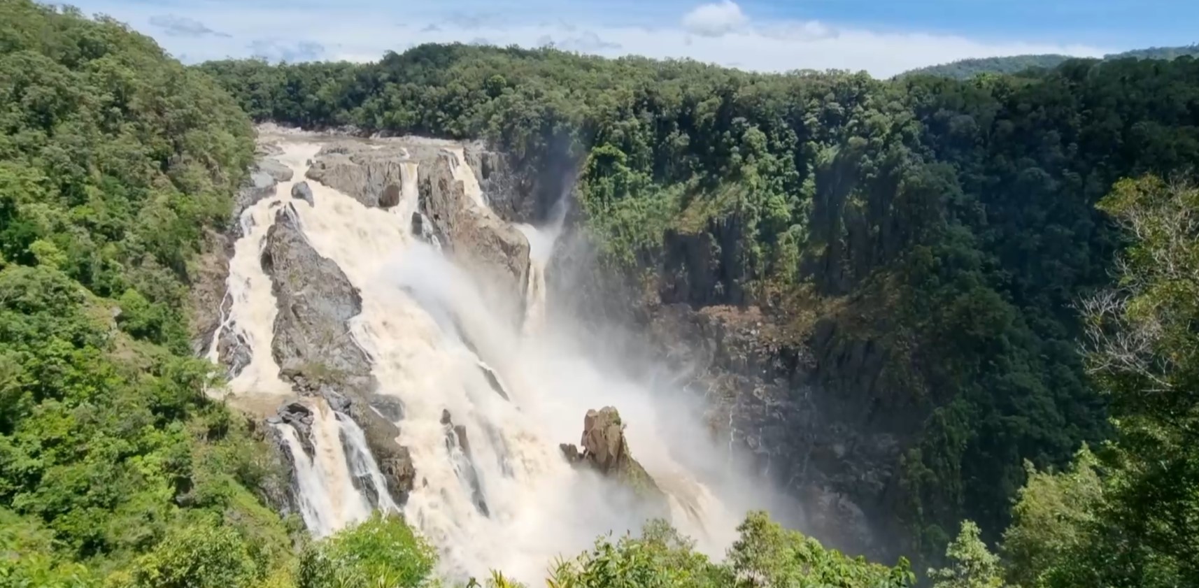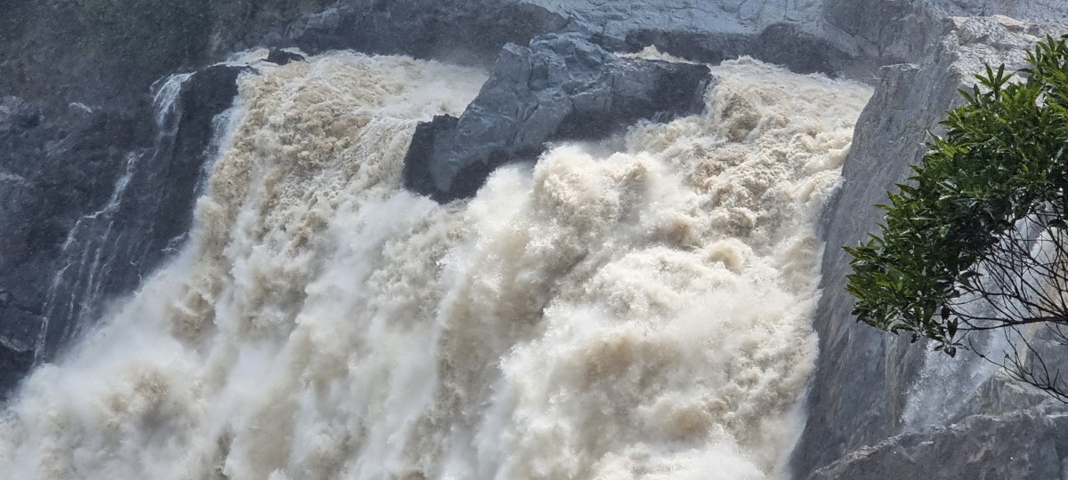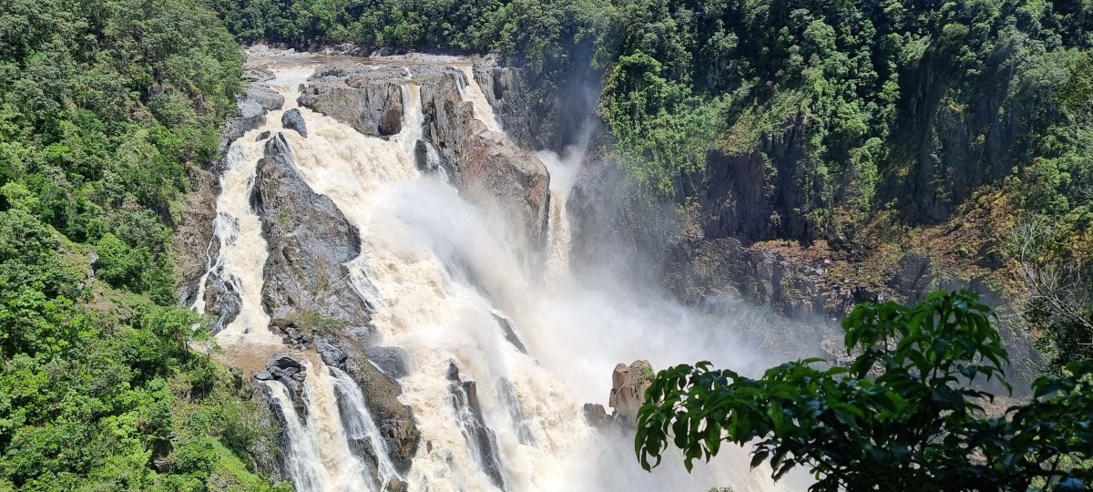 From here we took a winding mountain road, the Kaunda range Road which was taking us into the world’s oldest continually evolving rain forest (older even than the Amazon), seeing more evidence of the damage caused by the recent flood along the way. We stopped to be met by a Djabugay Aboriginal guide who took us to stand on a bridge and welcomed us by participating in “Calling to the Country” a ceremonial introducing yourself to the country and the ancestral spirits. We were presented with quartz stones and told to take one, rub it between our hand and under our armpits and then throw it into the water below, the idea being that the ancestors would recognise us by our scent if we return. He then took us to the Barron Falls which he knows by the local name Din Din (waterfall). The waterfall holds profound significance to the Djabugay people and he told us the story of the creation of the falls and we then proceeded along a series of walkways to get increasingly dramatic views of the falls.