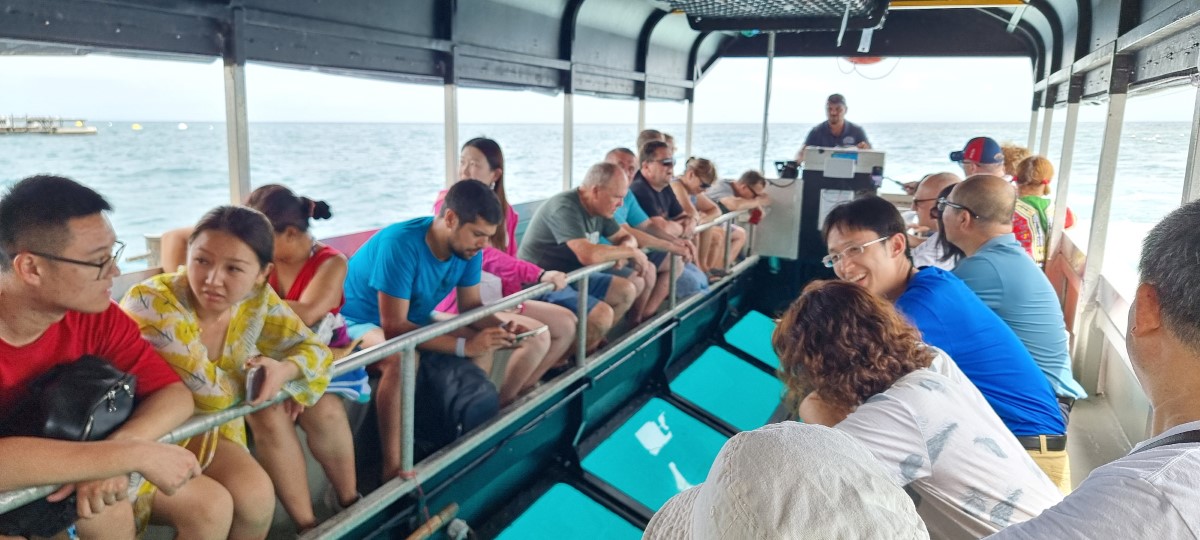 An early breakfast and then a short taxi drive to take us to the reef terminal to get a tour out to the Great Barrier Reef. The day started with clear blue skies and it got progressively hotter. There were a variety of tours and boats available, the one we had booked was a small catamaran with about 110 other tourists on board. We were taken out about 28 miles to a platform near one of the reefs. The journey took about 90 minutes in rougher seas than we were expecting. During this time we had a presentation about the reef. The platform was equipped for diving, snorkelling and various other activities. On arrival we took a short tour of the reef in a glass bottom boat which gave us a good view of the different types of coral and the variety of fish, including clown fish and many larger fish. After this we had booked a snorkelling session guided by a marine biologist who talked more about the coral and the fish. We saw a giant clam and the largest resident fish – a Maori Wrasse. After a buffet lunch we took the opportunity for more snorkelling before the return journey. We had a cultural presentation about the didgeridoo, how the instrument was made and how to play it. The colours and variety of corals and fish made a great, but tiring day.