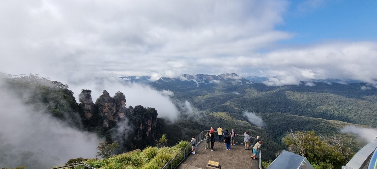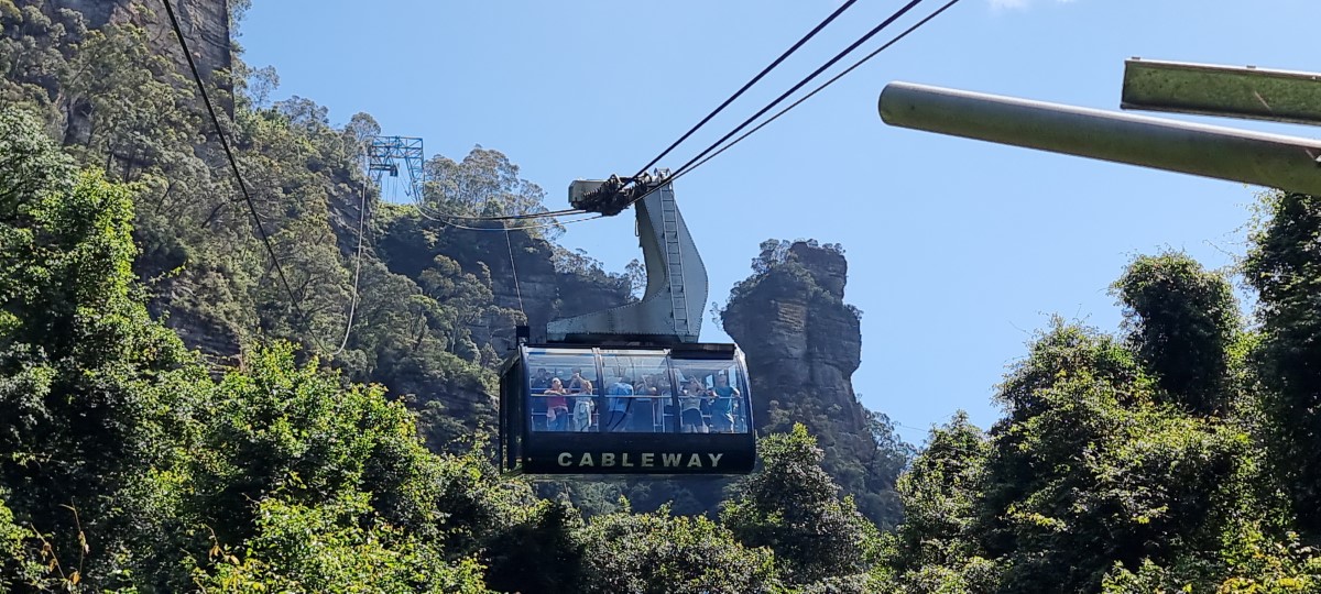 Up at 6 and no time for breakfast as we had to walk to meet our tour bus by 6.45. We then had a 2 hour drive to the Blue Mountains. The reason for the name is that from a distance the mountains have a blue appearance, this is due to diffraction of light by eucalyptus oils, pollen etc in the air. As we journeyed towards the mountains, the mist descended and we could see little. We stopped at a series of viewpoints, from which the mist would briefly clear giving us a partial view into the valley below. The eucalyptus trees here had been the victim of a massive fire 3 years ago, but they had quickly recovered and it would appear as if nothing had happened. We were lucky, the fog cleared and we had a great view of the Three Sisters (a line of 3 rock faces). We then transferred to different forms of transportation at Scenic World, taking two cable cars to travel down toward the bottom of the valley. Here we had a short board walk through the trees and saw the original coal mine which had been here (using Welsh miners). The journey back up was by means of the world’s steepest funicular. A short drive took us to an ex- servicemen’s club for a very good lunch. We continued our tour visiting another viewpoint (Serene Point) for some stunning views then headed back towards Sydney along the route we took this morning but now with perfect views of the scenery. We stopped to visit a wildlife park where we saw various species of kangaroos, koalas, birds and reptiles. The drive finished at the Sydney Olympic Park (Olympics in 2000) and we transferred to a ferry to take us into the heart of the city. We passed under the harbour bridge and berth alongside Cunard’s Queen Elizabeth – hopefully she will have left by Sunday as that is where our ship will be.