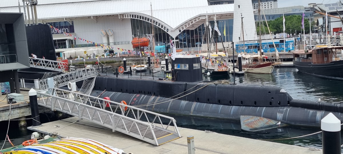 Today we visited the maritime museum a short walk from our hotel. We had passed here several times during the last few days and today was an ideal opportunity to visit. Moored outside the museum were a collection of boats, a lighthouse and a light ship some of which we could explore. We started with a submarine, not sure we would have liked to work in the cramped claustrophobic conditions. Notice the plaque showing that the engines were built in Greenock, Scotland. Then a naval vessel with quite heavy firepower. The highlights were a replica of the ship which brought the Dutch East India Company to Australia long before Captain Cook and a restored boat originally built in Sunderland and which started life trading from Glasgow. It ended its life as a rotting hull in Tasmania and was brought to Sydney and restored to sailing condition. Our last night in Sydney ended with ice creams and fireworks over Darling Harbour. Tomorrow we leave on the cruise so will update when and if we can.