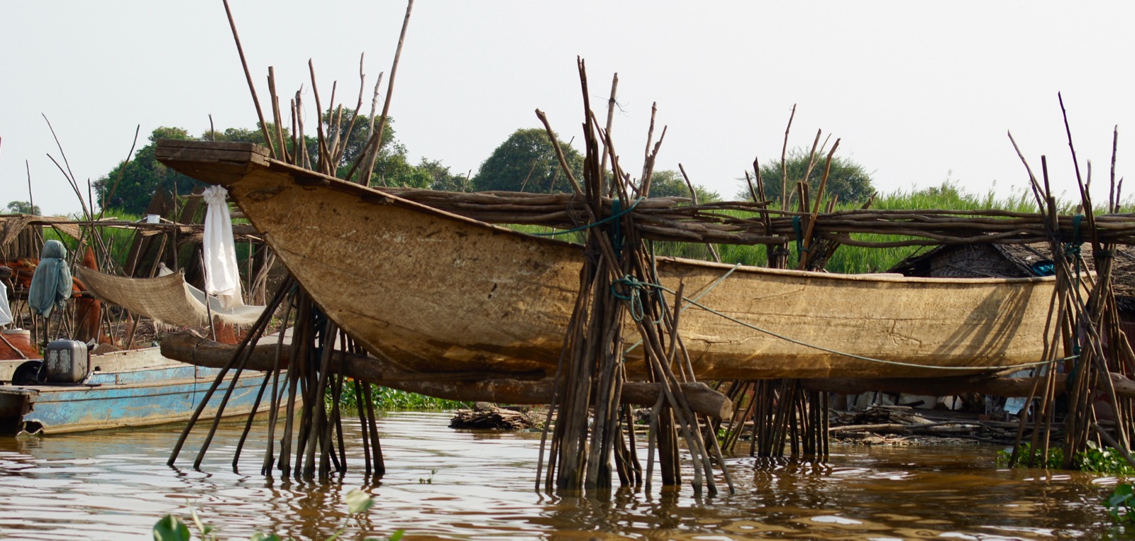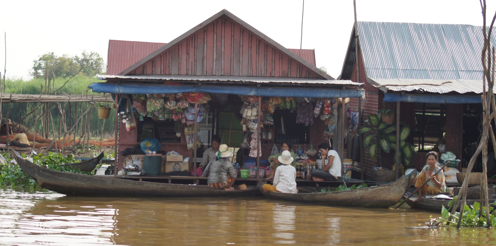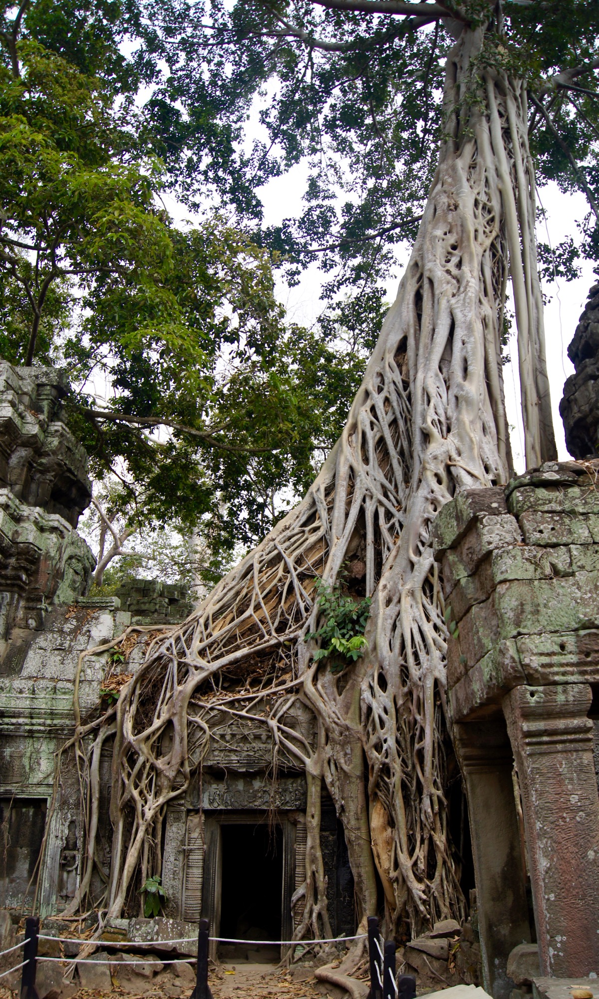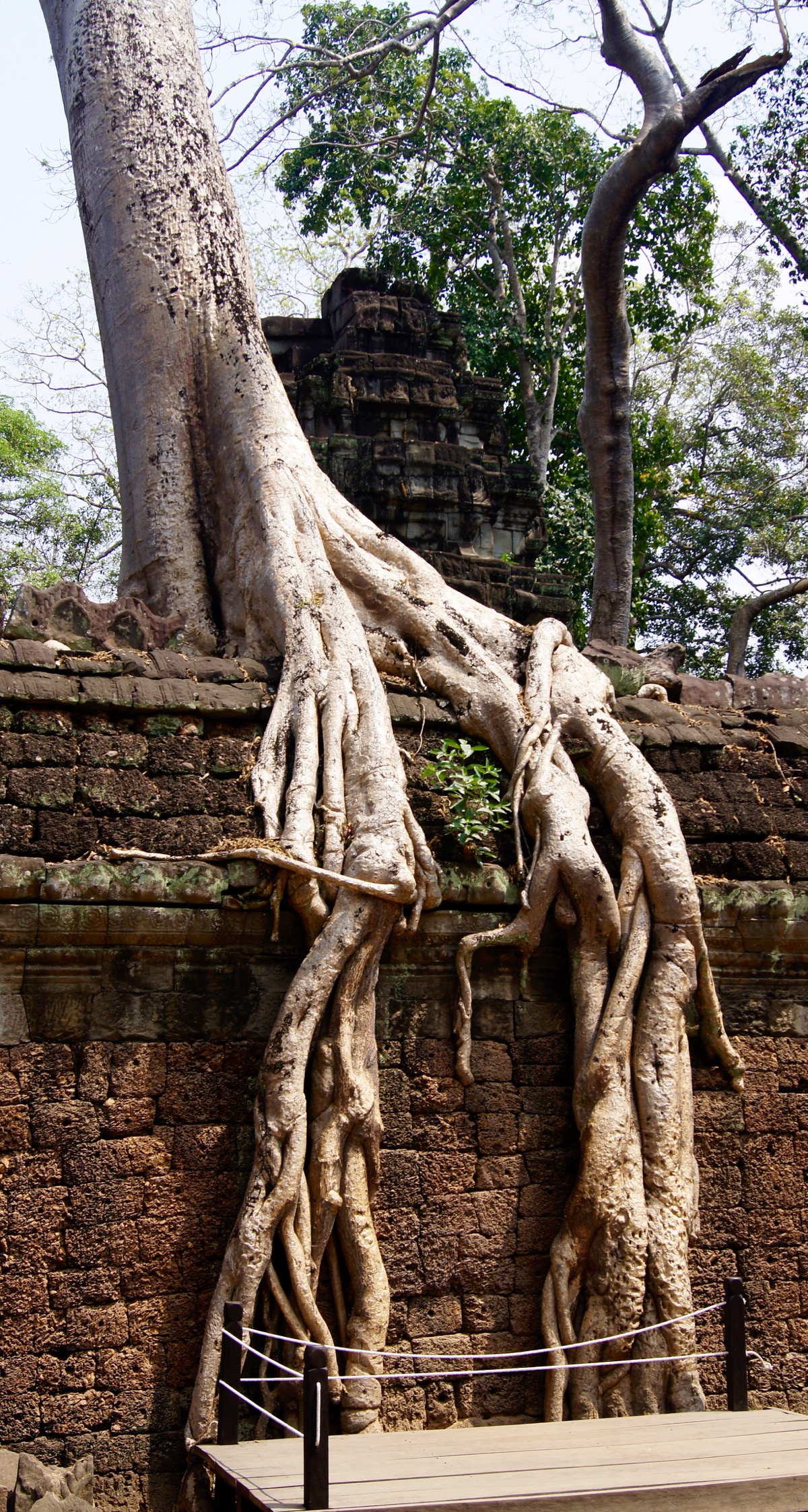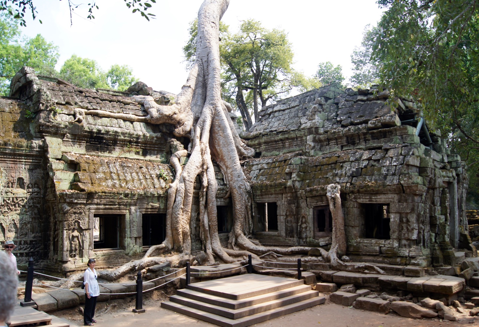 Yesterday morning started with a drive through the countywide to see another of the main temples, this one built of lovely red sandstone and again with kitschy fine carvings. On the return trip we stopped to see the production of palm sugar in one of the local villages. The houses are largely wooden and are raised up on stilts to prevent destruction by termites. After lunch was the final temple of the trip which was the one used in the “tomb raider” movie and was different because although partly restored had been left as it had been found with the roots of trees engulfing the buildings. After this we went for a cruise on the largest lake in the area ( during the rainy season the largest in the whole of Asia) to see the fishermen and their families who live in floating houses on the lake. We also visited a crocodile farm while there.