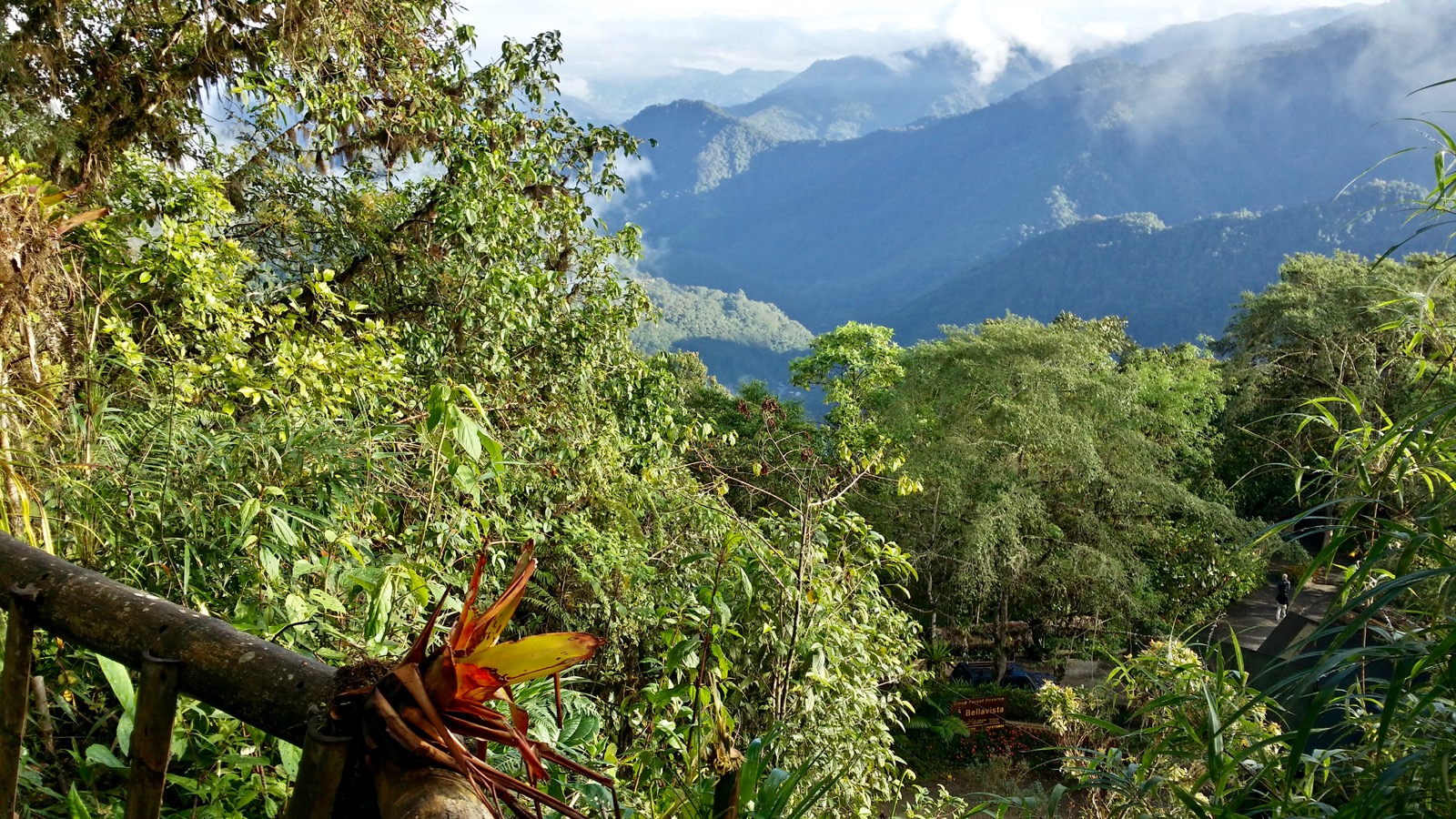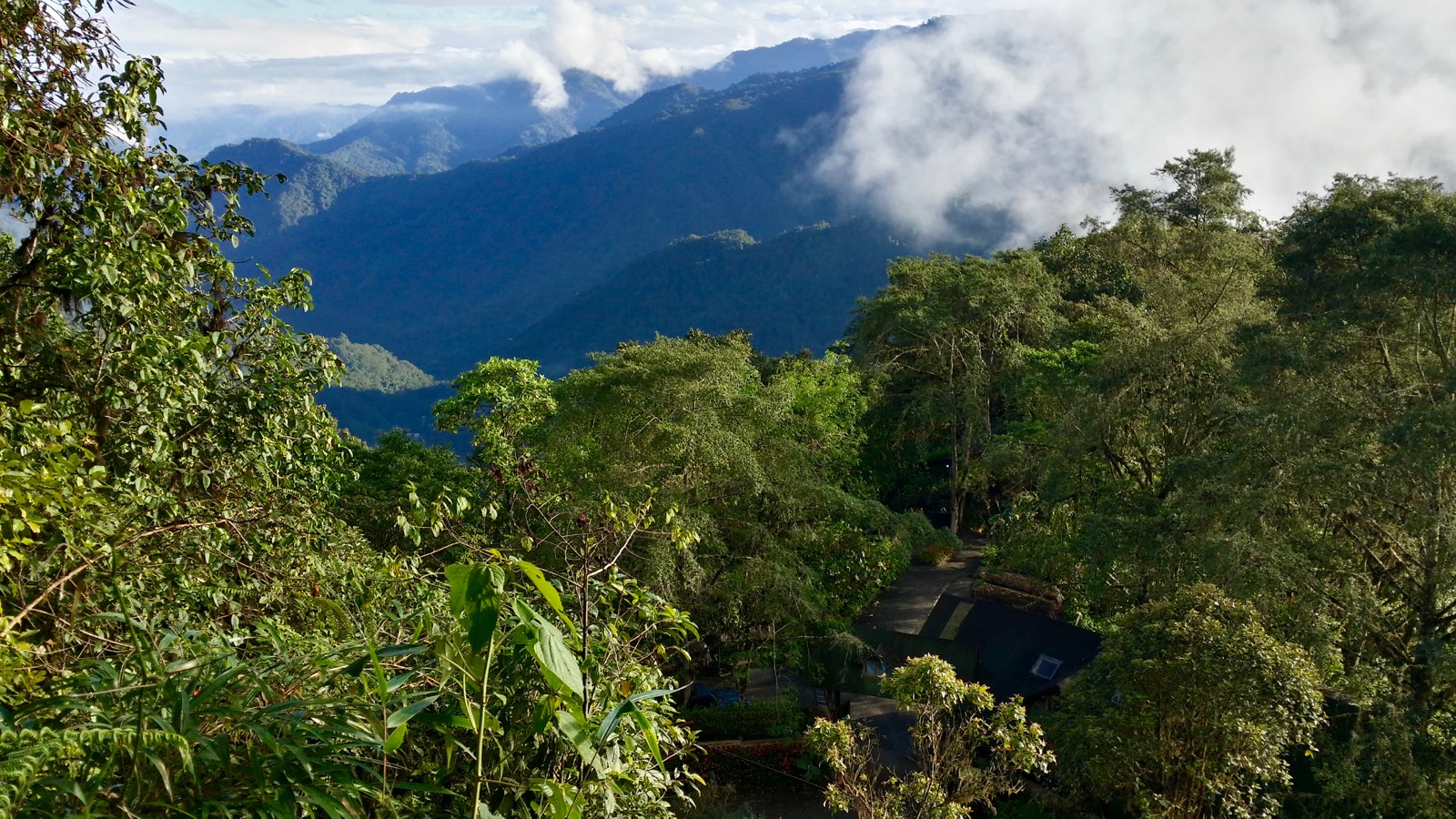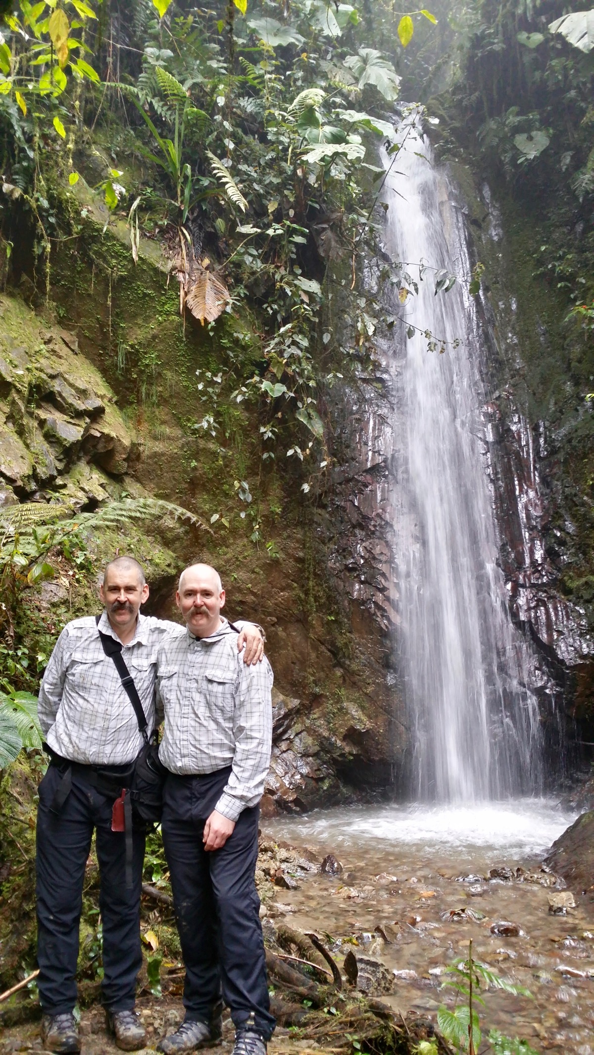 This morning we decided not to get up and join the bird watchers at 0645, but to have a long lie until 0700 when we got up to see the sun shining and the views across the valley. We also saw the butterflies and birds and spent more time watching the hummingbirds. After breakfast we took another guided walk, this time to the waterfalls – there were two alternatives, a harder trail which involved wading rivers and an easier option. We took the easier option which involved a steep descent on a slippery trail and occasional use of rope handrails, for an hour to reach the waterfall. The waterfall was impressive and entirely fed by rain water rather than a river. Then of course it was back the way we came and a steep ascent for an hour. We still haven’t acclimatised to the altitude so we were a little breathless! By this time the clouds had started to come back and by the time we went for lunch It was raining again. The drive back to Quito was the reverse of the way including the bumpy single track. As we left the valley and the cloud forest the skies cleared to cloudy blue skies. We had an hour or two to walk around the historic centre of Quito before dinner. Tomorrow we are off to the Jungle so it will be 3 or 4 days before we can send more updates on our progress.