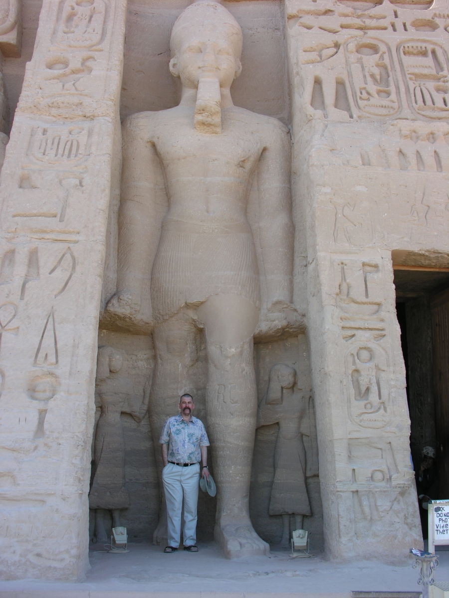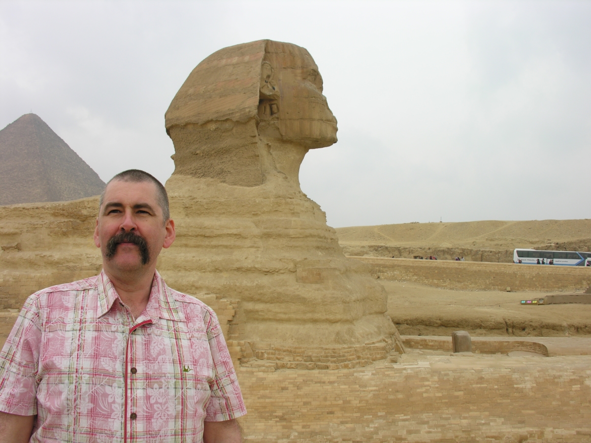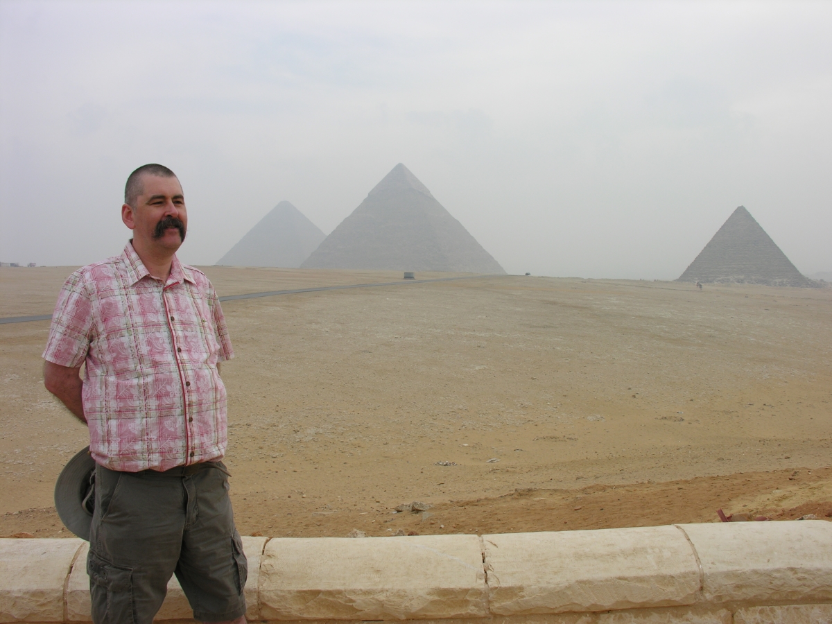 A cloudy day for our morning visit to the Giza plateau for a guided tour of the pyramids and sphinx. We declined the opportunity of a camel ride, but instead took the chance to go inside one of the pyramids. We were fortunate that the pyramid open at the time was the Great (Khufu’s) Pyramid. This was quite an experience, climbing up through the great gallery (thought to have been used as a slipway for the huge blocks of stone) and into the King’s Chamber. Until the 19th century the pyramid was the tallest building in the world and is estimated to be made up of over 2 million blocks of stone wishing on average 2.5tonnes each. We spent some time photographing the sphinx. We also visited the Solar Boat museum which holds a re-assembled full-size ancient Egyptian boat which had been discovered in pieces in a pit beside the pyramid in 1954. It took 14 years for experts to put its 1200 pieces back together using only authentic materials of wooden pegs and grass rope. Its called the Solar Boat because it resembles the images in tomb paintings of the boat in which the sun-god makes his daily trip across the sky. It is possible that the boat may actually have been used to take the body of Khufu from Memphis to his tomb at Giza. In the afternoon we took a scenic drive to Memphis, the first capital of Egypt in 3220BC. Most of Memphis was destroyed over the centuries by foreign invaders, but we saw some of the surviving pieces – the giant Alabaster Sphinx and a colossal limestone statue of Ramases II. We moved on to Saqqara to see the oldest pyramid in Egypt, the step pyramid of Djoser (Zoser). There are also tombs here of many high officials and we were able to go inside one and see the elaborate wall paintings. In the evening, we went for dinner and a short cruise in a boat on the Nile. During the evening there was entertainment in the form of dancing by whirling dervishes (very colourful) and a magician. The magician came round the tables performing close magic tricks, at one point I became alarmed because my camera had vanished from the table in front of me it was soon restored by the performer – a very impressive show!