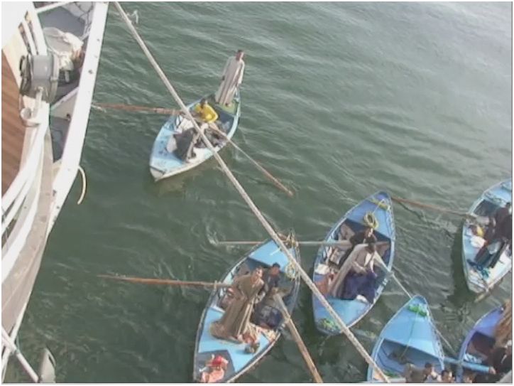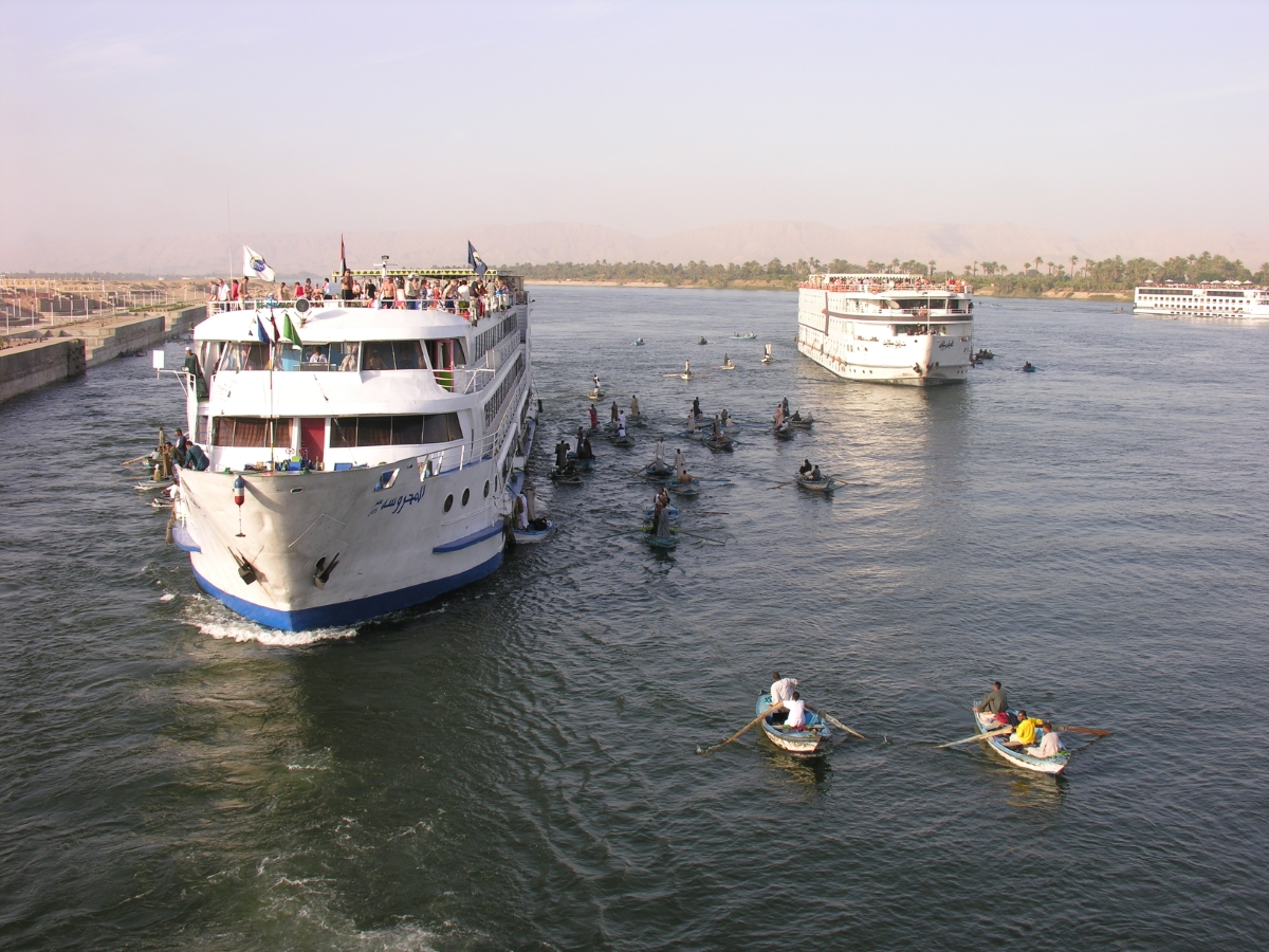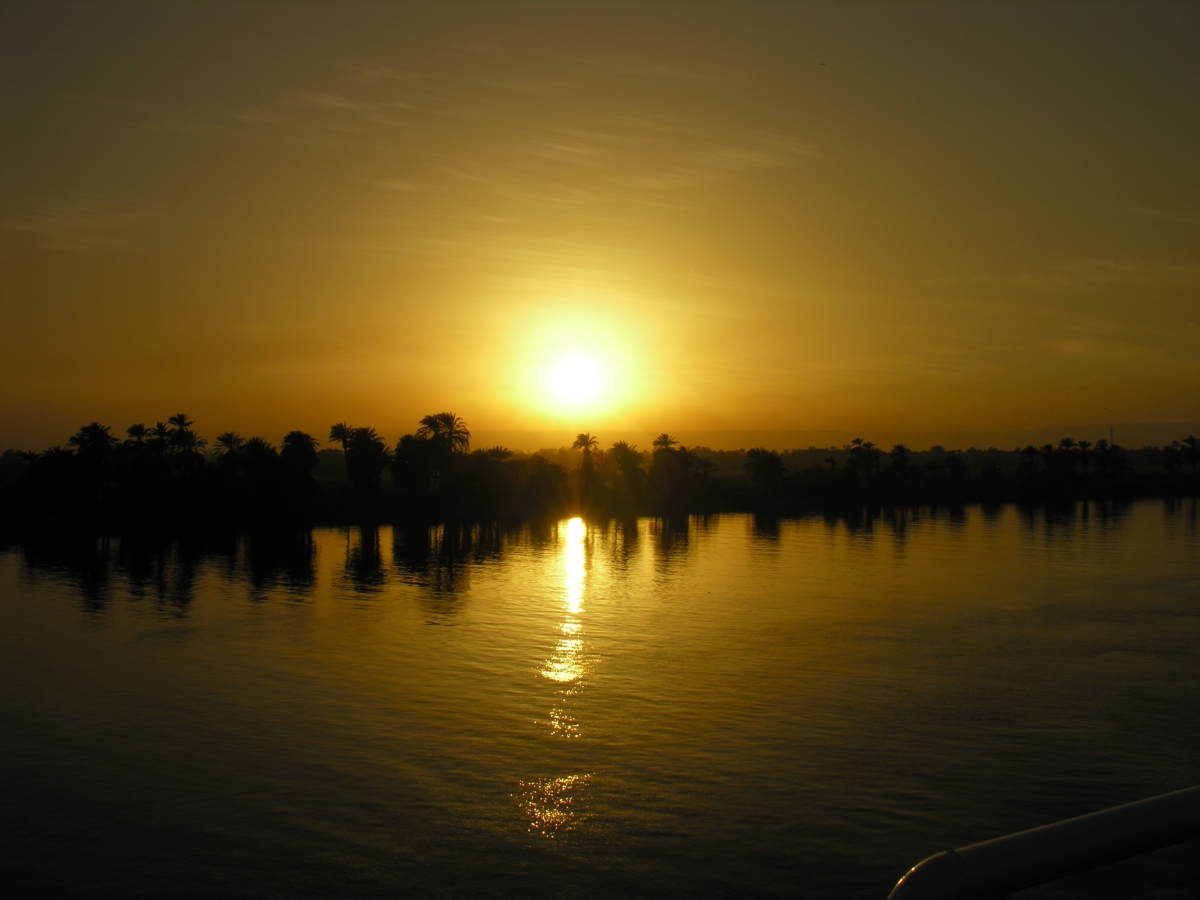 A relaxing day on the boat enjoying the scenery and watching the daily life on the banks of the river as we sailed back to Edfu. About half way between Luxor and Edfu, as part of schemes to control the river’s flow, there is a lock at Esna. It only took 20 to 30 minutes to pass through the look, but this was very entertaining as our bout was instantly surrounded by small boats filled with merchants trying to sell us souvenirs. They would throw plastic bags containing tee- shirts or other goods up onto the deck of our boat hoping we would throw the empty bag bak with money to pay them. A lovely sunset over the banks of the river.