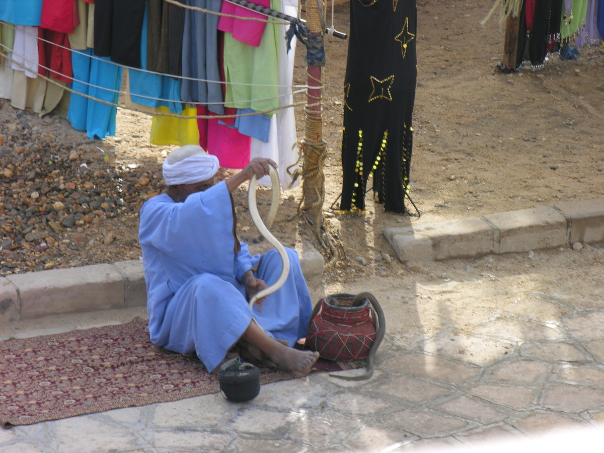 Today we sailed back to Aswan, stopping to visit the temple of Kom Ombo on the way. This temple is dedicated to two gods, the falcon god and the crocodile god. Looking down from the temple we watched a snake charmer plying his trade in the street below.